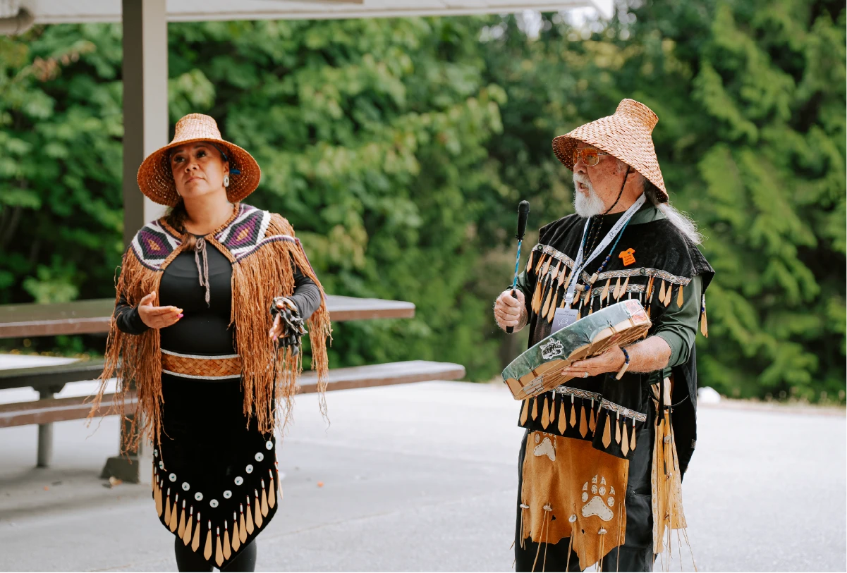 An outdoor Reconciliation Sessions event featuring Spakwus Slolem — the Eagle Song Dancers of the Squamish Nation — at Robson Square, August 8, 2026.